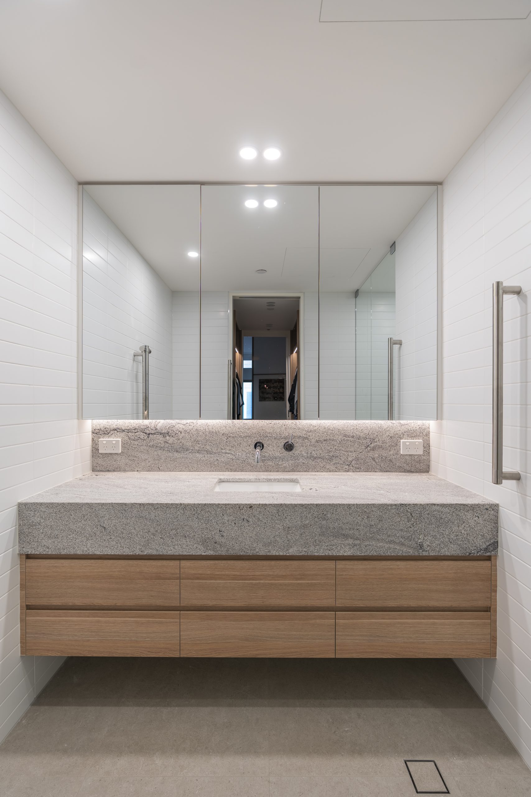 Lysterfield is a complete bathroom and balcony renovation, designed to maximise light, outlook, and a sense of quiet luxury. The space is anchored by a freestanding bath and feature floor-mounted spout, positioned to take in uninterrupted 180-degree views across the property.